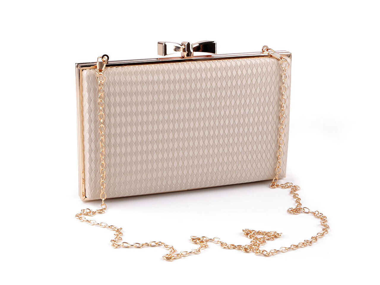 Malá společenská kabelka vyzařuje eleganci a luxus, má zajímavou povrchovou strukturu se saténovým leskem. Zdobí ji výrazné lesklé zapínání ve tvaru mašle a rámeček po celém obvodu. Kabelka je pevně vyztužená, její součástí je dlouhý odnímatelný řetízek na karabiny. Můžete ji nosit v ruce nebo jako crossbody přes rameno či do kříže.