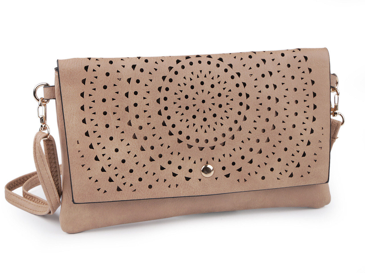 Malou kabelku z eko kůže si na první pohled zamilujete. Přední klopu zdobí vysekávaný vzor s mandalou. Součástí kabelky je nastavitelný popruh na karabiny, umožňující pohodlné nošení kabelky na rameni.