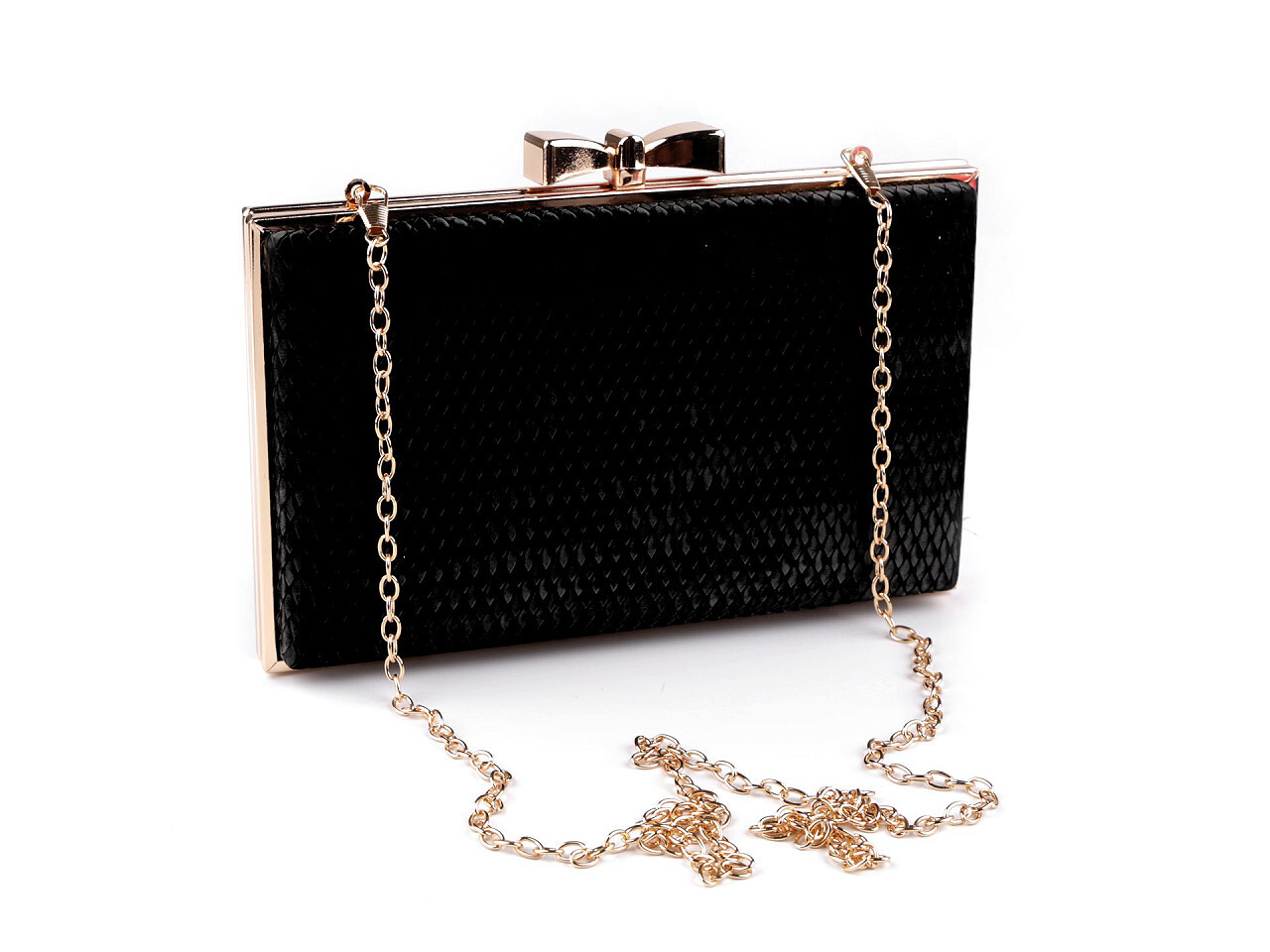 Malá společenská kabelka vyzařuje eleganci a luxus, má zajímavou povrchovou strukturu se saténovým leskem. Zdobí ji výrazné lesklé zapínání ve tvaru mašle a rámeček po celém obvodu. Kabelka je pevně vyztužená, její součástí je dlouhý odnímatelný řetízek na karabiny. Můžete ji nosit v ruce nebo jako crossbody přes rameno či do kříže.