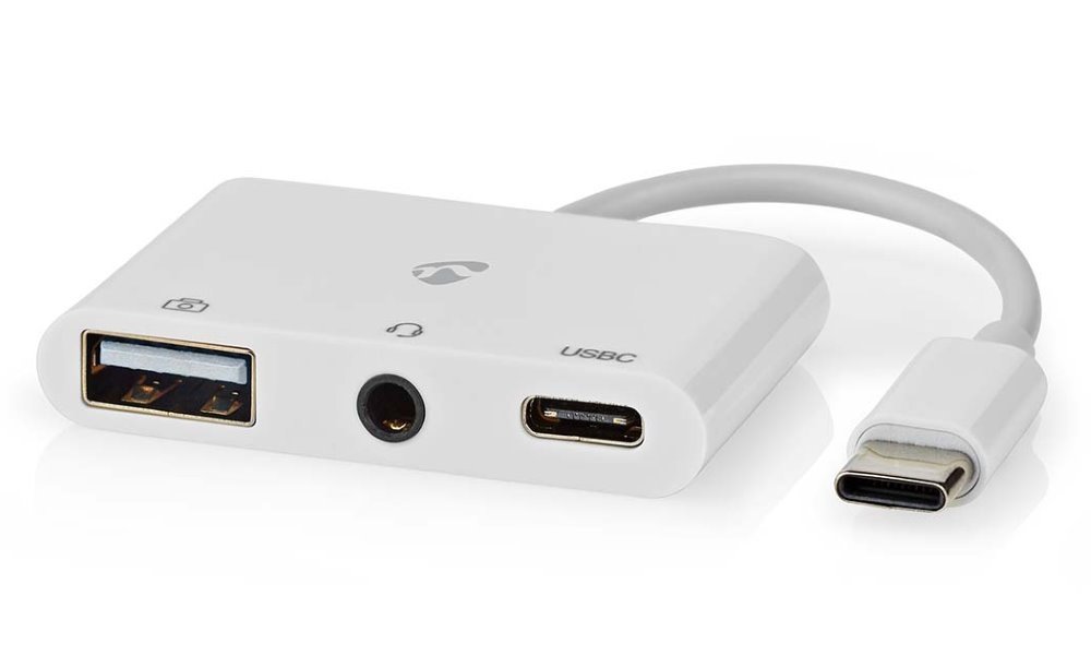 Nedis CCGB64790WT01USB adaptér pro notebooky, tablety a smartphony s konektorem USB-C nabízí rozšíření o porty USB-C, USB a kombinovaný 3,5 mm jack. ZÁKLADNÍ SPECIFIKACEKonektory: 1× USB-C, 1× USB 2.0, 1× 3,5 mm combo jackRozhraní: USB-C 2.0Délka kabelu: 10 cmBarva: bílá