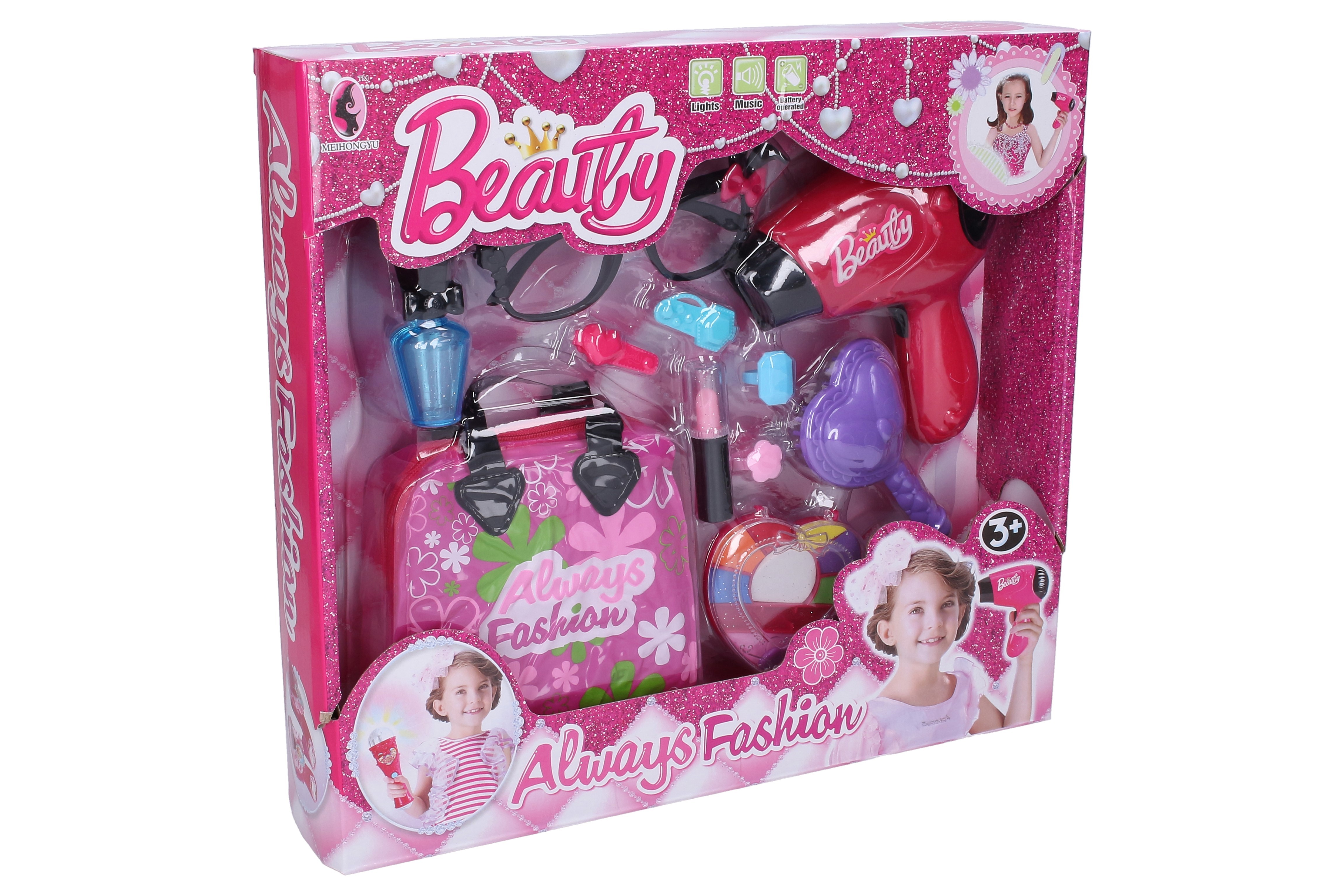 Kosmetický set s fénem. Balení obsahuje sponky, prsteny, rtěnku, makeup, voňavku, zrcátko, kabelku, brýle, a fén se zvukovými efekty. Fén - 1xAA baterie, není součástí. prečítať celé