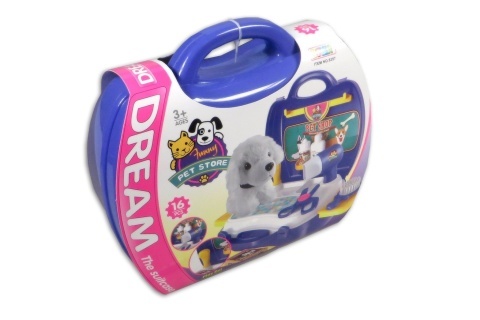 Sada psí salon obsahuje kufřík o velikosti cca 22 x 17cm, který lze složit a sestavi z něj salon. Dále obsahuje plyšového pejska, hřeben, fén, lahvičky, nůžky, sprchu a další potřeby. Materiál plyš a plast. Věk 3+. prečítať celé