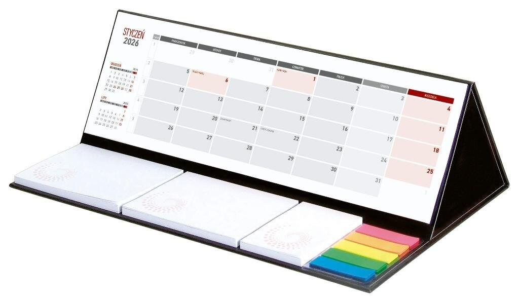 nr katalogowy: KB062B układ: trzymiesięczny format kalendarium: 309 x 99 mm druk: 2+0 format kalendarza: 315 x 192 x 112 mm foliowany pojedynczo opakowanie zbiorcze: 18 szt.Wygodny kalendarz stojący na biurko z przejrzystym kalendarium w układzie trójdzielnym z...