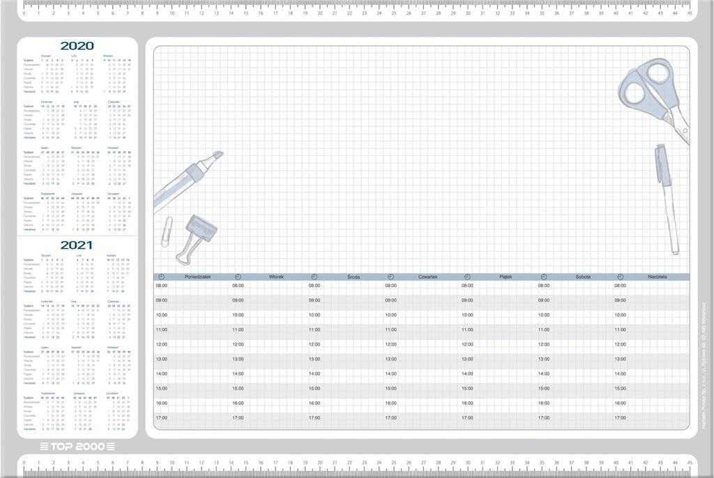 2 lata na stronie, 30 kartekDuży format daje wiele miejsca na notatkiNa górze skala z linijkąKalendarz na 2 lataLeży idealnie płasko na blacie biurkaSłuży również jako podkładka na biurkoKartki są klejone od dołu, dzięki czemu nie zawijają się podczas użytkowaniaPapier o gramaturze 90 g/m2