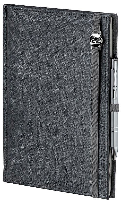 Kalendarz w oprawie Cross z gumką w kolorze oprawy. Na gumce ażurowa blaszka z datą. Blok kalendarza szyty nićmi. Kalendarz posiada: barwne mapy przedstawiające Polskę i kraje europejskie; rozbudowaną część informacyjną; przejrzysty układ graficzny kalendarium.Bez długopisu