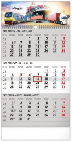 Profesionální tříměsíční plánovací kalendář s motivem dopravy a náhledem tří měsíců současně. Obsahuje kalendárium s českými jmény a světovými svátky na šedém pozadí s dopravním motivem. prečítať celé