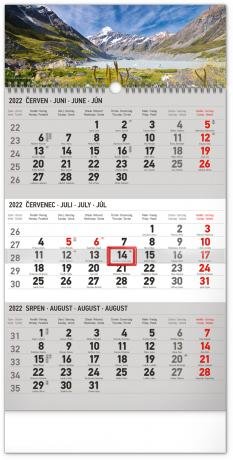 Praktický plánovací kalendář na šedém pozadí s motivem krajiny a náhledem tří měsíců současně. Obsahuje kalendárium s českými jmény a světovými svátky a posuvného jezdce pro snadnou orientaci. prečítať celé