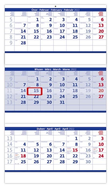 Formát: 31,5 x 55,5 cm Kalendárium: české tříměsíční jmenné + svátky vybraných evropských států (CZ / SK / A / B / D / F / H / CH / I / PL / RUS / UKR) Rozsah: 3 x 12 listů prečítať celé