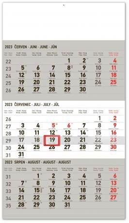 Praktický plánovací kalendář s tříměsíčním rozložením a orientační lištou s posuvným jezdcem. Obsahuje kalendárium s českými jmény a světovými svátky na šedém pozadí. prečítať celé