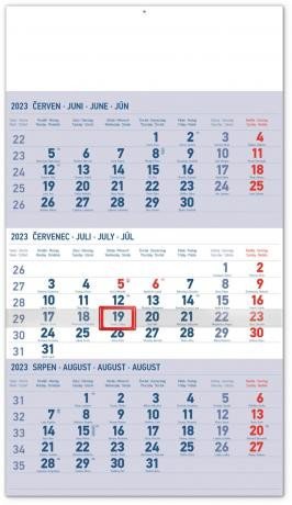 Praktický plánovací kalendář s tříměsíčním rozložením a orientační lištou s posuvným jezdcem. Obsahuje kalendárium s českými jmény a světovými svátky na světlemodrém pozadí. prečítať celé