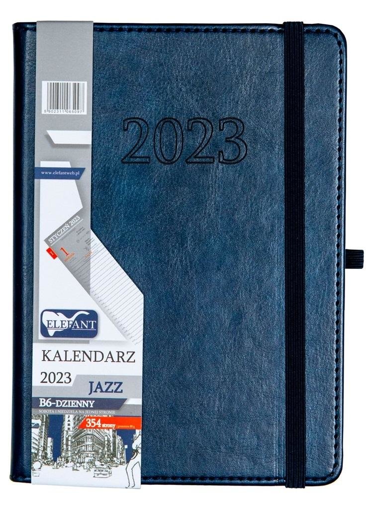 Kalendarz 2023 B6 dzienny Jazz granatowy ELEFANTFormat B6 - dziennywymiar: 176x125 mmpapier: delikatne chamois 80 g/m2ilość stron: 354+ zaokrąglone narożniki opraw i stron+ gumka spinająca kalendarz+ elastyczny uchwyt na długopis+ dwie tasiemki w kolorze gumki zamykającej+ koperta na odwrocie...