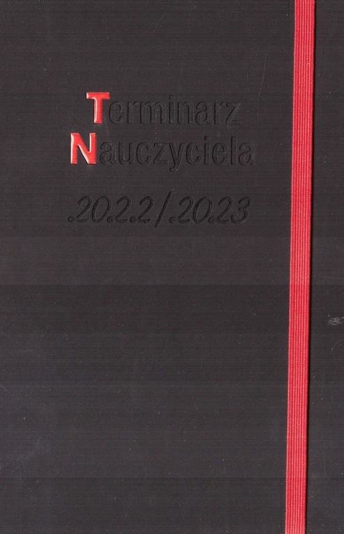 OKŁADKA- twarda, matowy laminat ztłoczeniem, z gumką i uchwytem na długopis, tłoczenie "Terminarznauczyciela 2022/2023" + dwie naklejkiBLOK - 140x205 mm, 140 str.,64g/m2, biały papier, druk 2 kolory, kieszonka na tylnej wklejcetasiemka, blok kalendarza szyty nićmi, kapitałka, perforacjanarożników