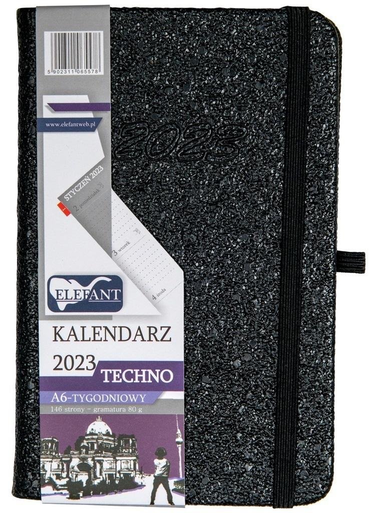 Kalendarz 2023 A6 tyg. Techno czarny ELEFANTFormat A6 - tygodniowywymiar: 140x92 mmpapier: delikatne chamois 80 g/m2ilość stron: 146+ zaokrąglone narożniki opraw i stron+ gumka spinająca kalendarz+ elastyczny uchwyt na długopis+ tasiemka w kolorze okładki+ koperta na odwrocie okładki+ możliwość...