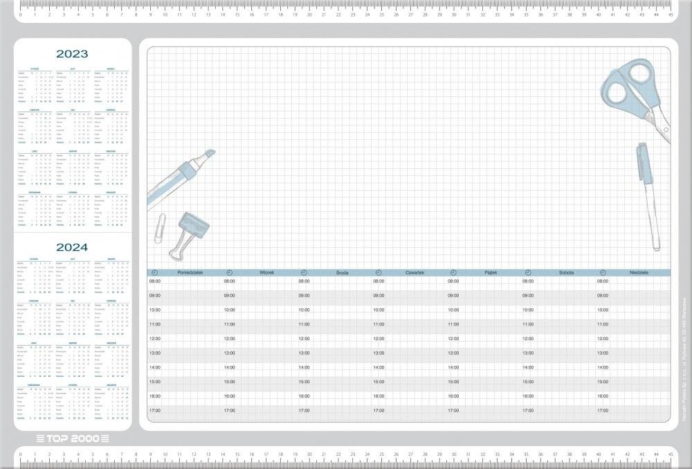 Biuwar z kalendarzem, dzięki któremu będziesz miał wszystkie swoje zapisane myśli zawsze pod ręką. Kartki klejone od dołu - nie zawijają się podczas pracy przy biurku. Dużo miejsca na notatki - możesz zapisać i naszkicować wszystkie swoje pomysły czy ważne daty. Nadrukowana linijka do pomiarów długości. 2023/2024 - 2 lata na jednej stronie. Format 48 x 32,5 cm. 30 odrywanych kartek.