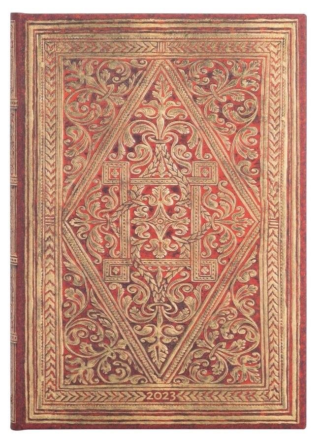 Kalendarz 2023 ekskluzywnej marki Paperblanks. Format midi typu horizontal - cały tydzień rozplanowany jest na 2 stronach. Kalendarium w języku angielskim. W środku miejsce na notatki, roczny planer, oznaczone wybrane święta międzynarodowe, mini kalendarium, międzynarodowe numery telefonów,...