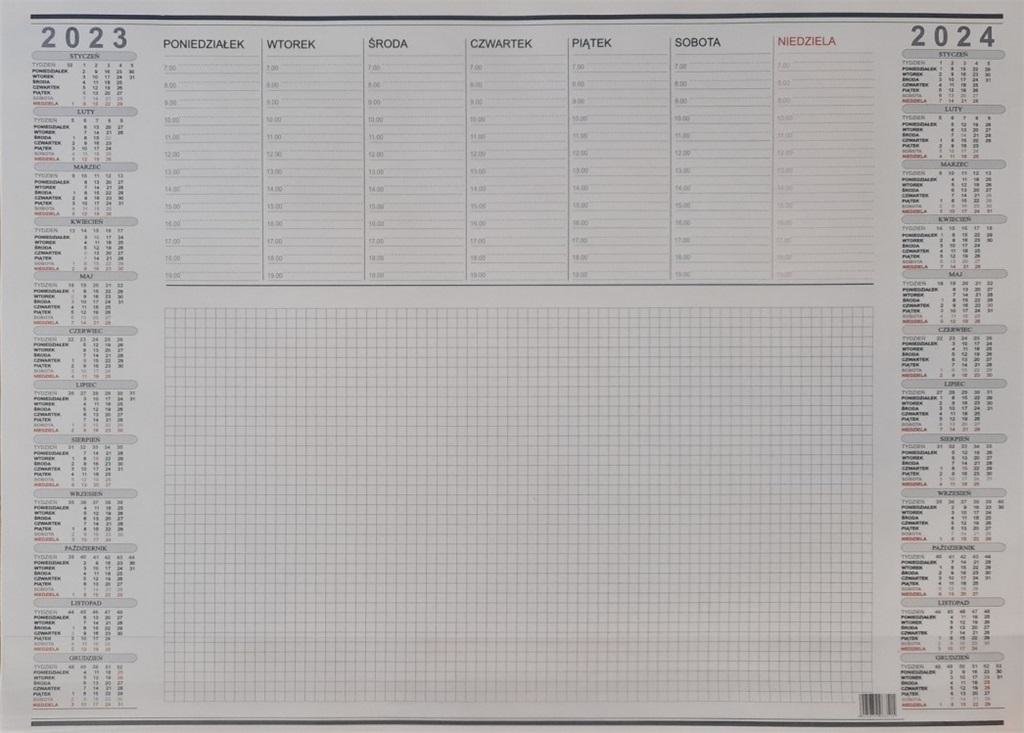 Biuwar z bezbarwną listwą PCVwymiary szerokość 59cm wysokość 42,5cm30 kartekpapier offsetowy 80gkalendarium 2 letnie 2023/2024układ tygodnia godz 7-19w centralnym miejscu biuwaru DUŻO miejsce na notatki prečítať celé