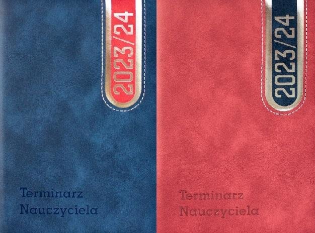 OKŁADKA: Thermo PU skóropodobna z obszyciem, gąbką 3mm, złoceniem lub srebrzeniem roku 2023/24 i napis "Terminarz Nauczyciela"BLOK - 140x205 mm, 360 str., papier biały 64g/m2, druk 2 kolory, tasiemka, kolorowa mapa Polski oraz Europy na wyklejkach, blok kalendarza szyty nićmi, kapitałka,...
