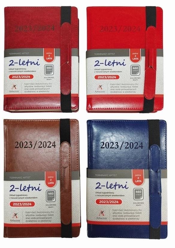 TERMINARZ DWULETNI .Blok: 140 x 205 mm, 460 stron, papier kremowy 80 g/m2, druk 2 kolory, kolorowa mapa Polski na wyklejce z przodu, 2 LETNIE KALENDARIUM (2 pełne lata) z planerem na 3 lata, na końcu część informacyjna, blok kalendarza szyty nićmi, 2 tasiemki, perforacja narożników, kieszonka na...
