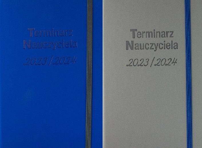 OKŁADKA - twarda, matowy laminat z tłoczeniem, z gumką 7 mm i uchwytem na długopis, tłoczenie "Terminarz nauczyciela 2023/2024" + dwie naklejkiBLOK - 140x205 mm, 140 str., papier biały 64g/m2, druk 2 kolory, kieszonka na tylnej wklejce, tasiemka, blok kalendarza szyty nićmi, kapitałka, perforacja...