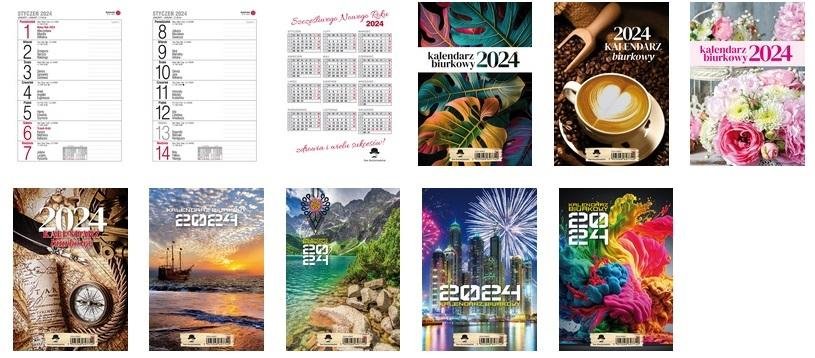 Kalendarz Biurkowy A5 TYGODNIOWY PIONOWY. Oprawa czarna spirala na GRUBEJ podstawie kartonowej. Format 145/210mm. Papier offsetowy, okładka papier kredowy. 54 strony (układ tygodniowy ) + okładka. Mix wzorów, pakowany po 8szt. Kalendarz zawiera imieniny, nazwy świąt, numeracje tygodni, znaki zodiaku, wschody i zachody słońca. Dodatkowo nazwy miesiąca i dni tygodnia w języku Angielskim i Niemieckim.