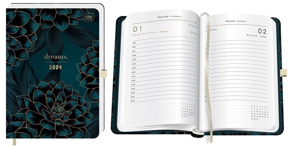 Format A5. Liczba stron: 384. Zaokrąglone rogi. Okładka z modnym metalicznym efektem. W środku kolorowa wyklejka. Twarda oprawa skutecznie chroni zawartość przed zniszczeniem. Kalendarz w układzie dzień na stronie z podziałem na godziny pozwala na szczegółowe zaplanowanie każdego dnia. Wyposażony w praktyczne dodatki: tasiemkę do zaznaczania strony i pętelkę na długopis. W środku także: adresówka, praktyczne kalendarium oraz miejsce na dodatkowe notatki.