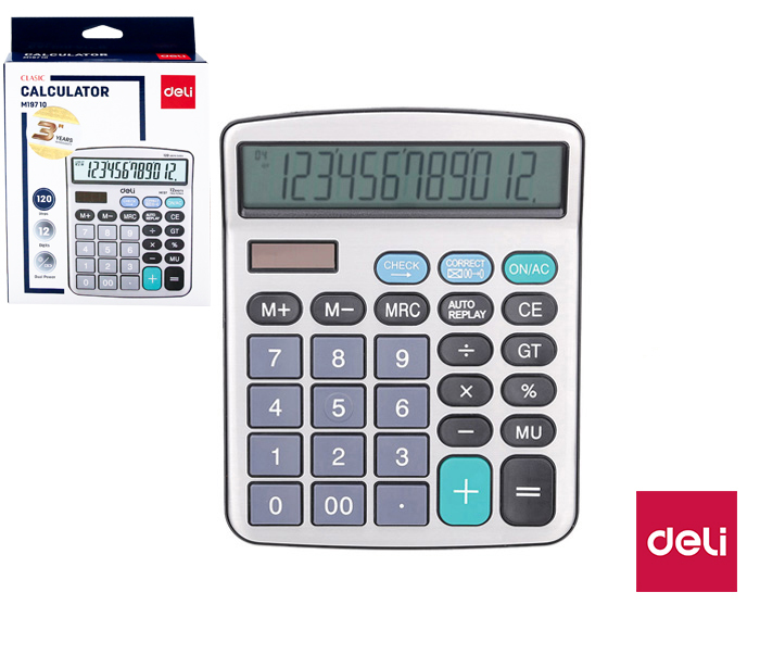 12 místný displej- velký displej- kovový povrch- plastová tlačítka- napájení solární / baterie- obsahuje tlačítko suma, procenta, výpočet marže, krok zpět- automatické vypnutí- paměť 3 tlačítka- kontrola 120 kroků- oprava C- automatické vyvolání- snadný náhled- rozměr 180,7 x 144,2 x 39,7mm