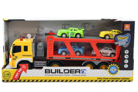 Kamion na baterie (jsou součástí balení). Po stisknutí tlačítek kamion vydává zvuky a svítí. Měřítko 1:16. Obsahuje také 4 plastová autíčka. Rozměry kamionu cca 40 x 12 cm. Věk 3+ prečítať celé