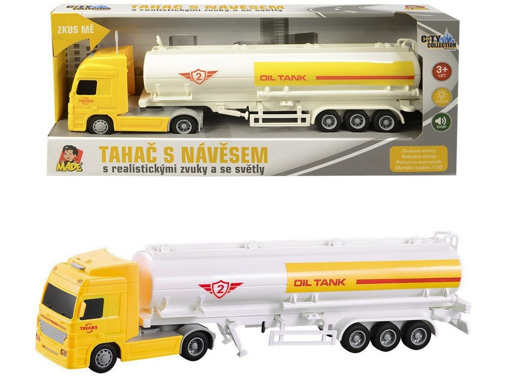 Kamion cisterna na setrvačník se světelnými a zvukovými doplňky z kolekce City collection. Český box o rozměrech 36,5 x 7,5 x 14,5 cm. Kamion má rozměry 8 x 33 x 5 cm. Měřítko 1:50.Pohon na setrvačník, světelné a zvukové doplňky. Napájení: baterie 3 x AG 13 knoflíkové (jsou součástí). Vhodné pro děti od 3 let.