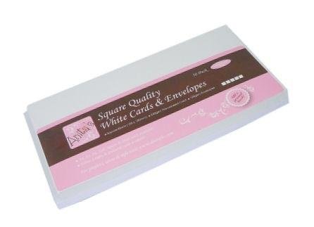 Zestaw 50 białych baz kartek oraz 50 białych kopert w kwadratowym formacie.