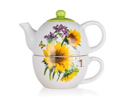 Konvička se šálkem SUNFLOWER jsou vyrobeny z keramiky v bílé glazuře s dekorem slunečnic a zeleným víčkem konvice. Objem konvice je 360 ml a objem šálku 330 ml. Konvici se šálkem je možné mýt v myčce na nádobí, ale pro zachování dokonalého vzhledu, doporučujeme umývat ručně. prečítať celé