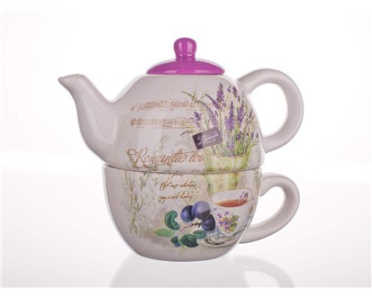 Konvička se šálkem LAVENDER, objem konvice 360 ml, objem šálku 330 ml, materiál - keramika, bílá glazura s dekorem levandule, fialové víčko konvice. prečítať celé