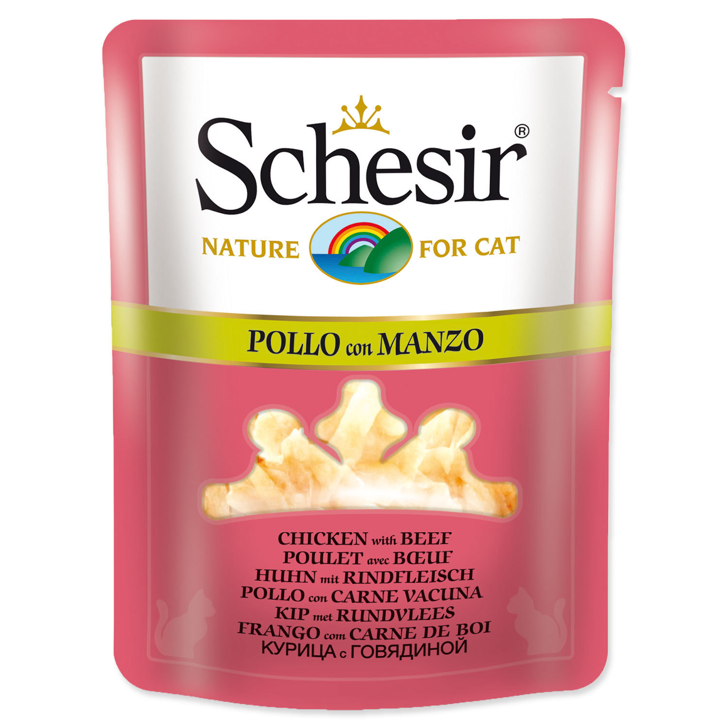 Doplňkové krmivo pro dospělé kočky.Krmný návod: kočkám o hmotnosti 4 kg podávejte maximálně 2 kapsičky denně v kombinaci s mokrým nebo suchým kompletním krmivem Schesir.Složeni: maso a živočišné produkty (56% kuřecí maso, 4% hovězí maso), 3% rýže.Jakostníí znaky: hrubé proteiny 14%, vlhkost 83%,...