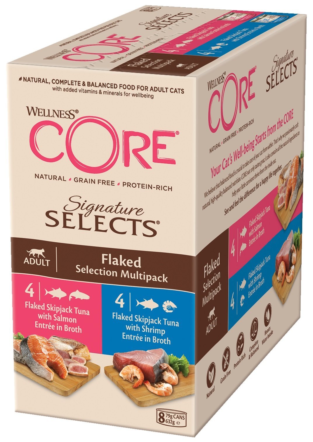 Wellness CORE Signature Selects přirozeně dodává bílkoviny, je velice chutné a má texturu po které vaše kočka touží. Selection Multipack je s jemnými plátky tuňáka, losose a krevet v lahodném vývaru, chutný a pohodlný způsob jak poskytnou kočce kompletní a vyváženou stravu.