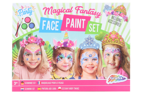 Sada obsahuje 7 barev na obličej, 2 štětečky, 2 tužky, šablony, třpytky, 2 nanášecí houbičky, kartonové korunky a gumička. Rozměr balení cca 23 x 30,5 x 5 cm. Věk 3+ prečítať celé