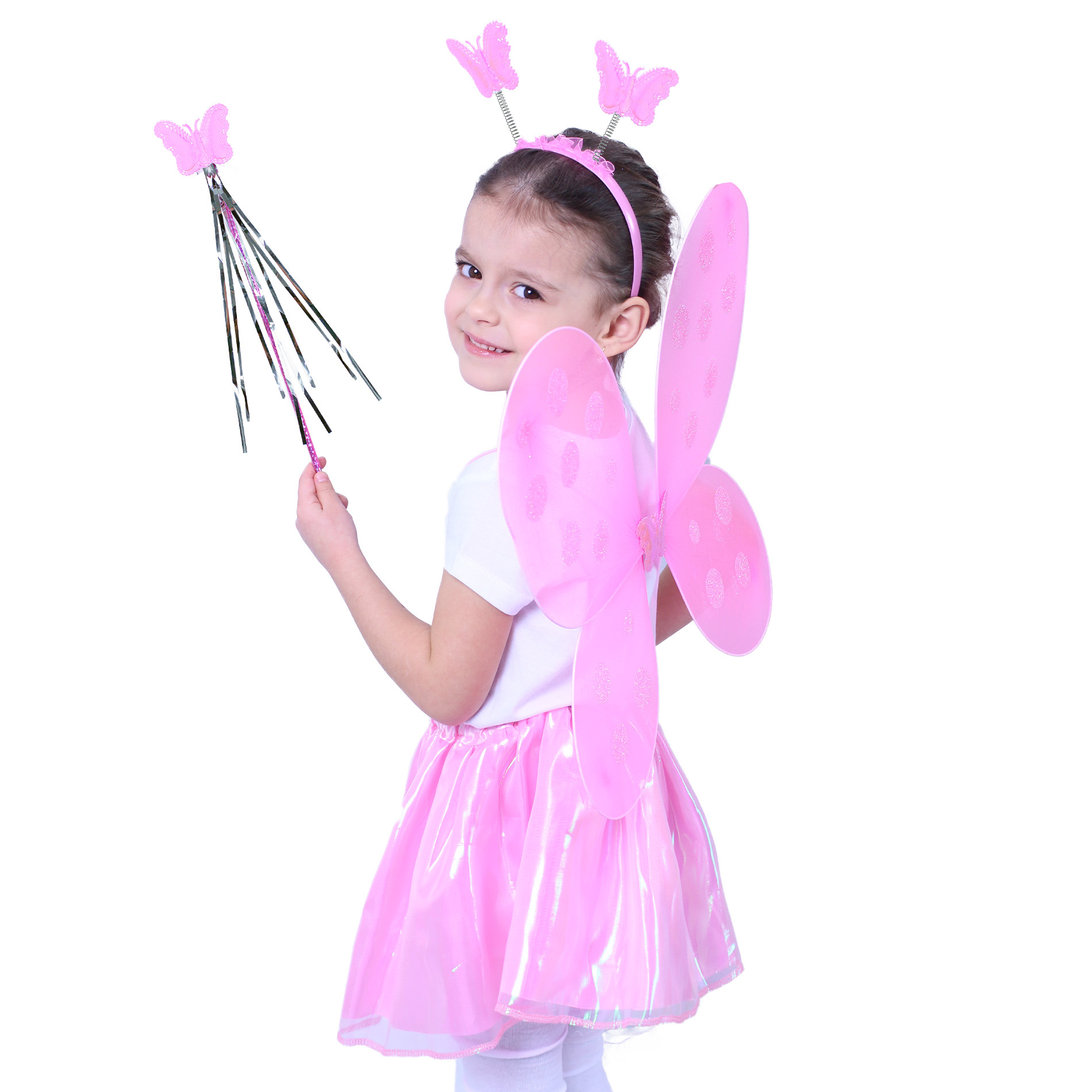 Roztomilá růžová motýlí křidélka na gumičku jsou určena pro holčičky ve věkovém rozmezí 3-10 let (104-150 cm). Součástí této karnevalové sady je také čelenka s motýlky na pružinkách a hůlka. prečítať celé