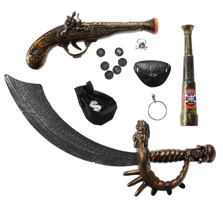 ZESTAW DZIELNY PIRAT (Z LUNETĄ) W skład zestawu wchodzą: szabla, pistolet, luneta, opaska na oczy, srebrny pierścionek z czaszką, duży okrągły kolczyk, worek monet Długość szabli: 47 cm Długość pistoletu: 29 cm Długość lunety: 10 cm Materiał: plastik prečítať celé