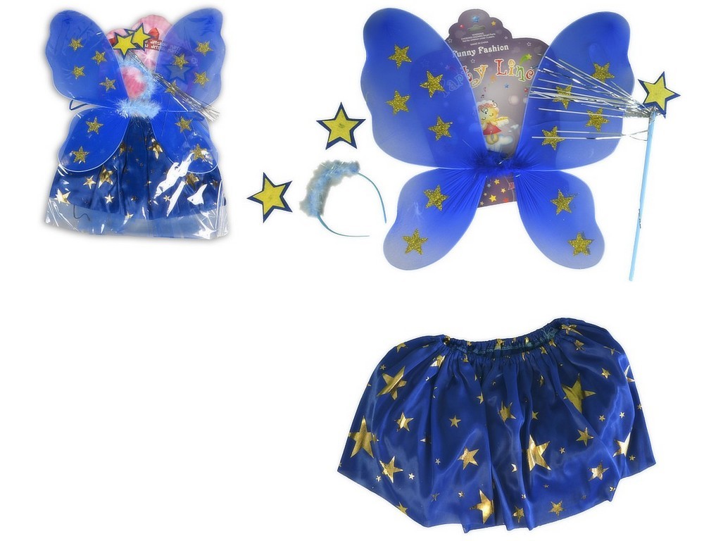 Kostým pro večernici.Kostým s křídly v modré barvě jsou doplněny hvězdičkami.Součástí balení je hůlka,křídla,sukně,čelenka.Určeno pro děti 5-9let. prečítať celé