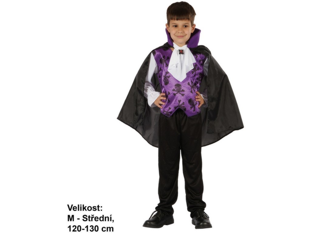Karnevalový kostým - Upír.Velikost: Střední (120 - 130 cm).Kostým je vhodný pro kluky ve věku 5-9 let.Balení obsahuje:- košili- plášť- fižiNeobsahuje:- boty- kalhoty. prečítať celé