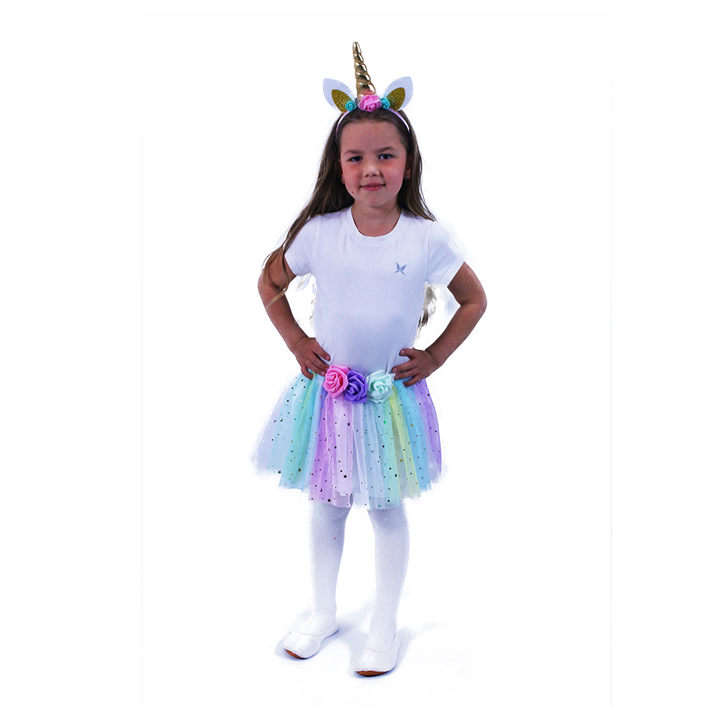 - Kúzelný dizajn: farebný tyl s hviezdičkami a čelenka so zlatým rohom dodajú vášmu dieťaťu rozprávkový vzhľad.