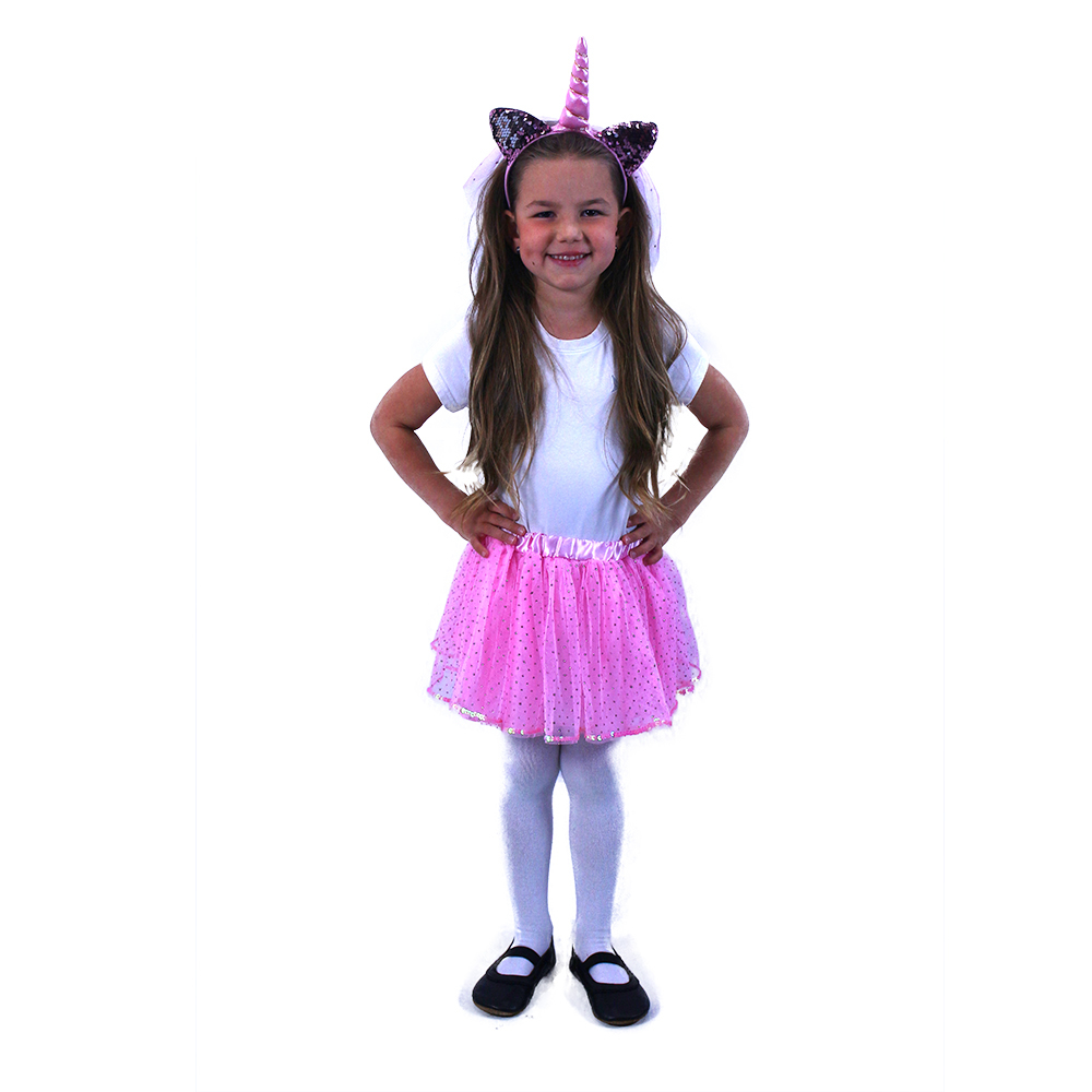 Roztomilá sukýnka TUTU nesmí žádné holčičce v šatníku chybět! Saténová sukénka je zdobena růžovým tylem s dekorem a ve spodní části doplněna flitry. Je určena pro holčičky ve věkovém rozmezí 3-10 let (104-146 cm), v pase je na gumu a její délka je cca 26 cm. Součástí této sady je senzační čelenka jednorožce s rohem a ušima!