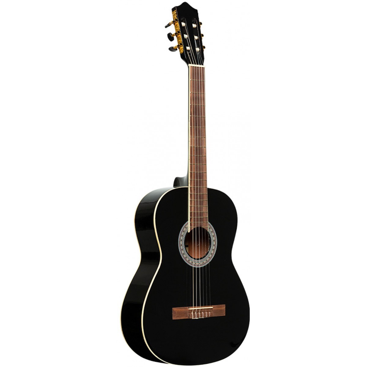 Klasická 4/4 kytara. Vrchní deska smrk, spodní deska a luby okoumé, krk nato s kovovou výztuhou, hmatník a kobylka ořech, menzura 646 mm, černá výložka (ABS), mechanika polouzavřená zlatá s černými knoflíky, struny Savarez. Barva černá lesklá.