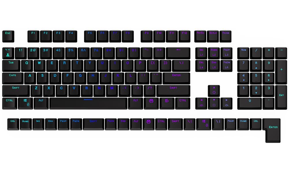 Set skládající se ze 124 černých kláves s průsvitnými popisky. PBT materiál zajistí komfort při každodenním používání i dlouhodobou odolnost proti opotřebení. Součástí je i sada tlumících gumových kroužků nainstalovaných přímo na klávesách a plastová pinzeta pro vyjmutí kláves.