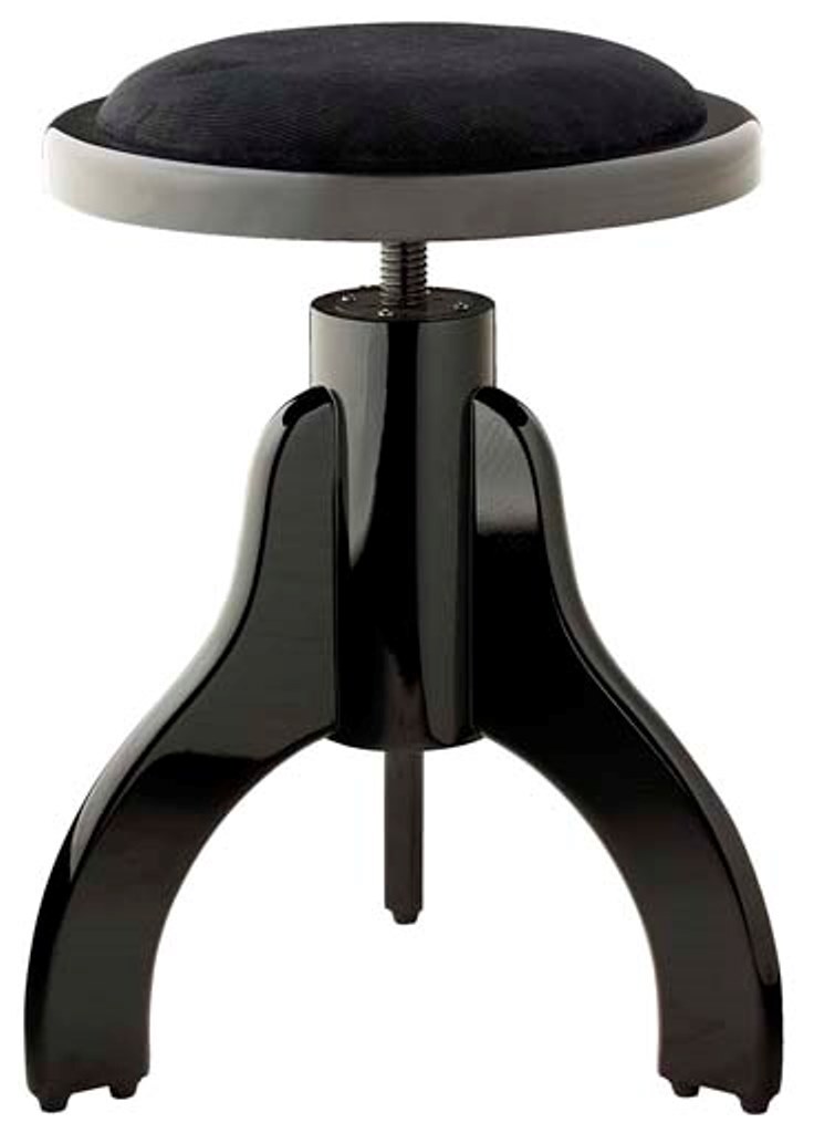Stolička ke klavíru kulatá, vytáčecí 45 - 55 cm, průměr sedáku 35 cm, čalounění 30 cm, nosnost 100 kg, hmotnost 5 kg. Barva černá lesklá, sedák černý samet.
