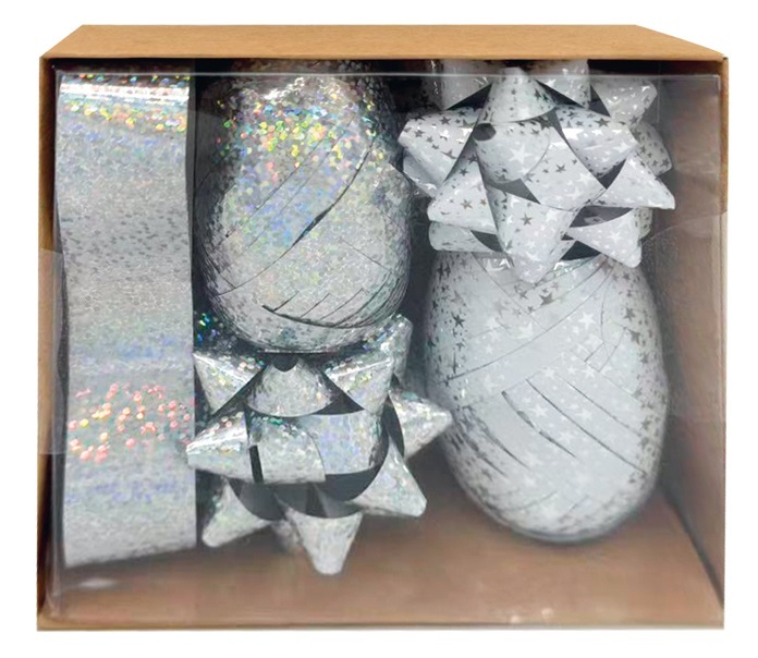 Sada na balení dárků stříbrná, rozeta 5 x 2 x 5 cm 4 ks, stuha 0,5 cm x 10 m 2 ks, stuha 2 cm x 2 m
