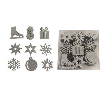 Sada dekoračních přízdob. Sada obsahuje 72 přízdob. Rozměry : 2 - 3,5 x 0,4 cm, výška 3 - ,5 cm. Barva : stříbrná. Materiál : flís. prečítať celé