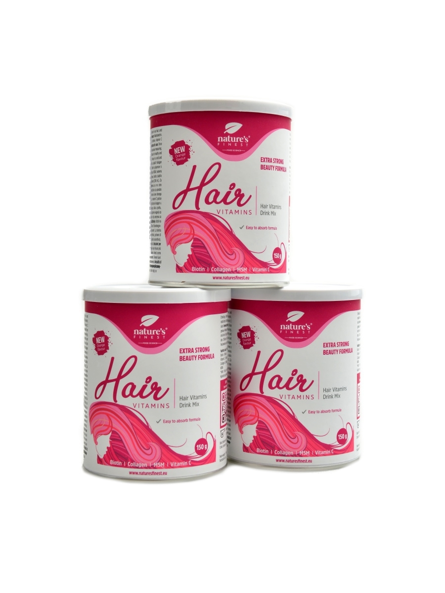 Hair Vitamins Drink Mix je komplex látek pro podporu kondice a vzhledu vlasů. Obsahuje kolagen, MSM, vitamín C a D-biotin. Doplněk je ve formě rozpustného nápoje s pomerančovou příchutí, dochucený je steviol-glykosidy a erythritolem. Účinek všech obsažených látek je synergní a souvisí se stavem vlasů, nehtů a kůže.