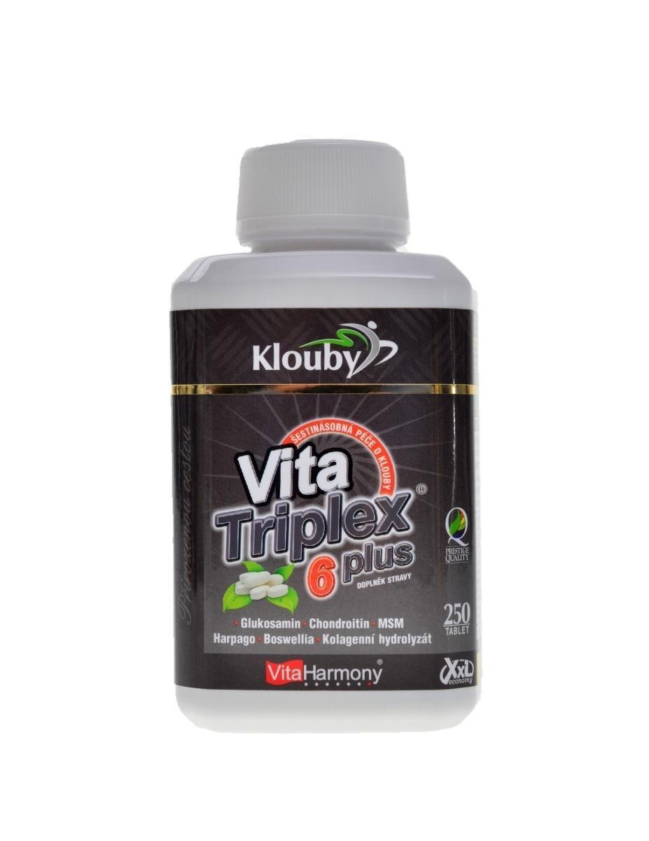 VitaTriplex® 6 plus je osvědčenou kombinací chondroitin sulfátu, glukosamin hydrochloridu, MSM, kolagenního hydrolyzátu, harpago-phytum procumbens a extraktu boswellie serrata. Jednotlivé látky jsou navrženy v biologicky účinných dávkách pro kloubní chrupavky.