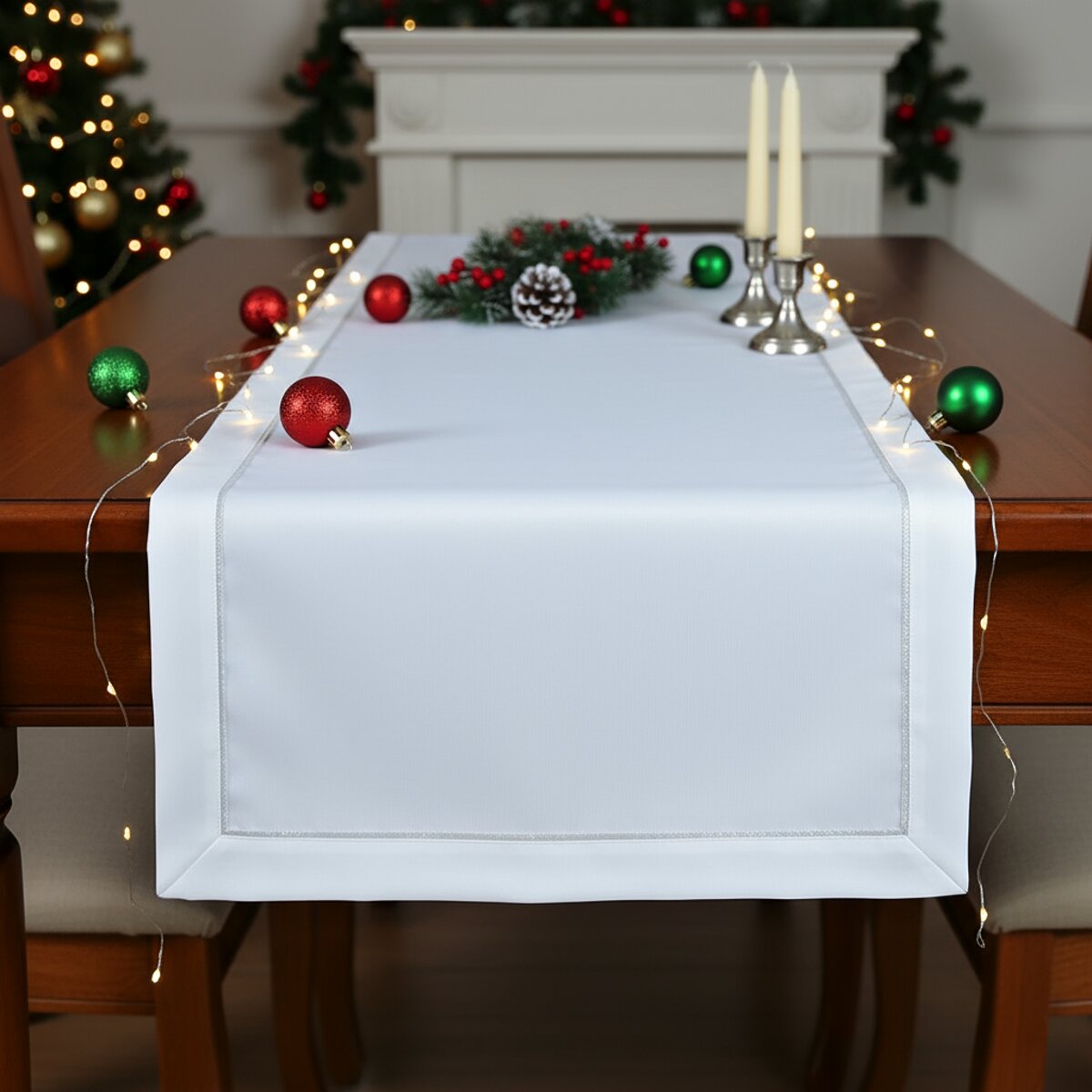 ? Dekorační běhouny na stůl dodají každému prostřenému stolu styl a eleganci. Jsou skvělým doplňkem pro každodenní stolování i slavnostní příležitosti. Díky kvalitním materiálům a pečlivému zpracování se snadno udržují a dlouho vydrží krásné. Stříbrné lemování v kombinaci s látkou v barvě lurexové vánoční bílé dodává interiéru luxusní, přátelskou vánoční atmosféru.