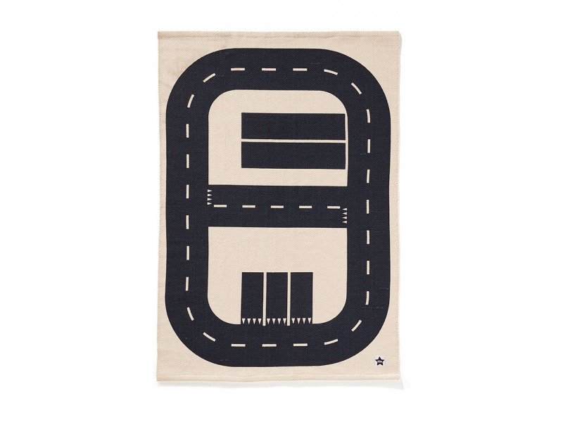 Koberec v designu silnice je ideální pro hru s autíčky a dalšími doplňky ze série dřevěných hraček Aiden. Můžete tak vytvořit v dětském pokoji město s parkovištěm, garáží, servisem, benzínovou pumpou atd.Slouží i jako krásná dekorace dětského pokoje.Složení: 100% bavlnaRozměry: 130 x 90 cm