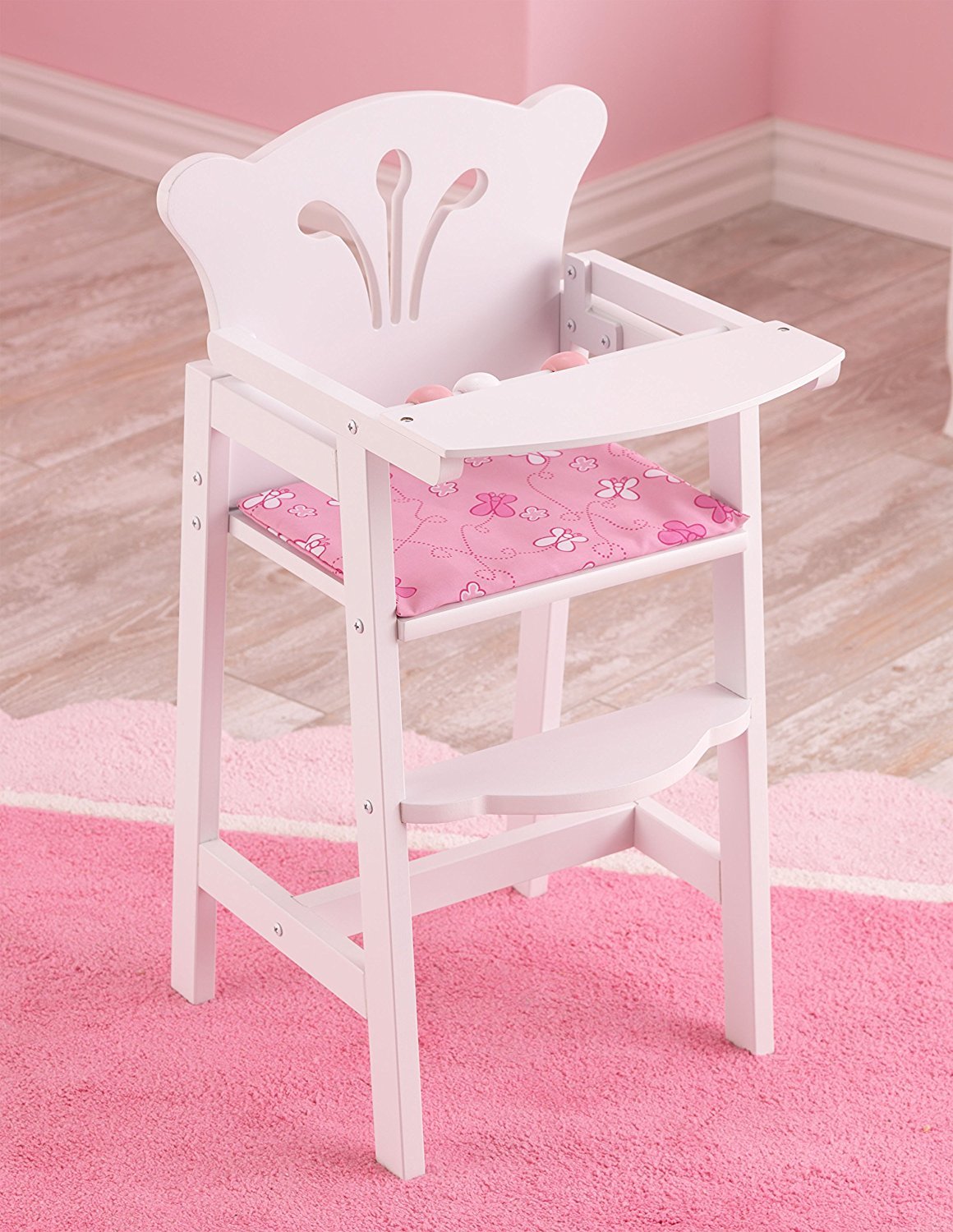 KidKraft jídelní židlička pro panenku bíláJídelní židlička pro panenky v bílé barvě s růžovým obustranným polstrováním a odjímatelnou jídelní částí. Krásná židlička s propracovanými detaily skrývá i možnost hry u jídelní části. Vhodné pro panenky do velikosti 50 cm. Vyrobeno z MDF. Stabilní...